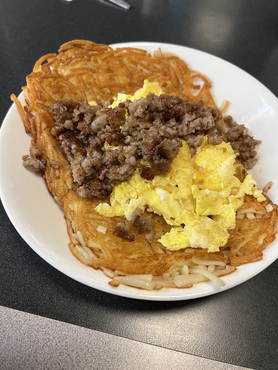 Their hashbrown bowls are a highlight: for example, “Sausage Hashbrown Bowl” or “Cheesesteak Melt Hashbrown Bowl.”